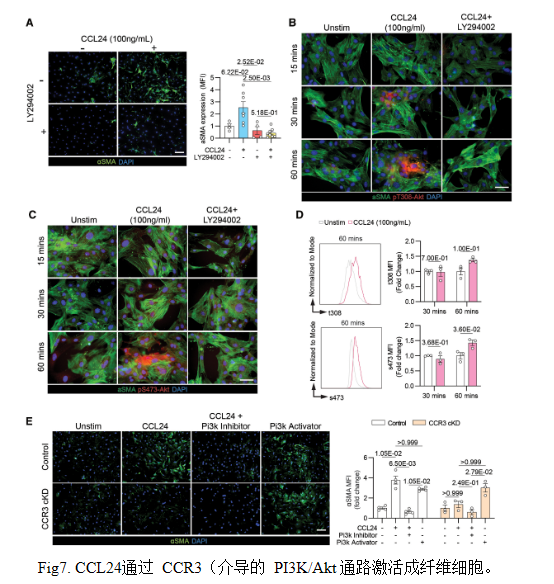 CCL24经CCR3触发PI3K-Akt信号:刺激30–60分钟磷酸化Akt,PI3K抑制剂或CCR3缺失均阻断αSMA上调;直接激活PI3K可绕过CCL24诱导肌成纤维细胞活化,证实PI3K-Akt为CCL24-CCR3促纤维化核心通路。