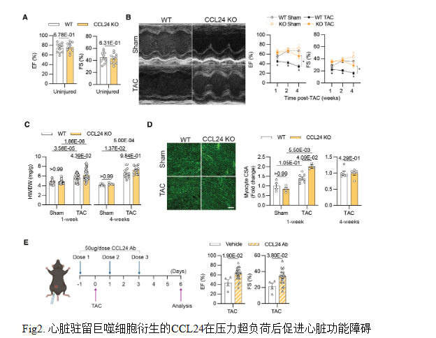 CCL24缺失不改变稳态或压力负荷后心脏各免疫细胞亚群数量及炎症基因表达,提示其促纤维化与心功能障碍作用独立于炎症细胞浸润变化。
