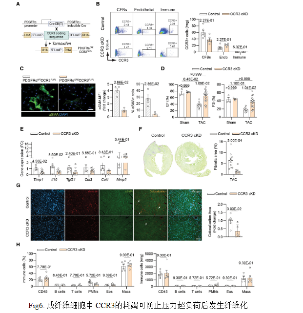 构建成纤维细胞条件性CCR3敲除小鼠(CCR3 cKD),他莫昔芬诱导后CCR3表达显著下降。TAC术后1周,CCR3 cKD小鼠射血分数和缩短分数提高,Col1、Col3、Timp1等纤维化基因下调,胶原沉积与肌成纤维细胞面积减少,心功能改善且不依赖免疫浸润变化,证实成纤维细胞CCR3介导CCL24促纤维化作用。