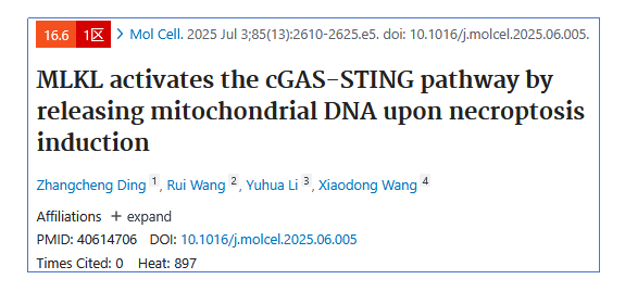 Ding Z, Wang R, Li Y, Wang X. MLKL activates the cGAS-STING pathway by releasing mitochondrial DNA upon necroptosis induction. Mol Cell. 2025 Jul 3;85(13):2610-2625.e5. doi: 10.1016/j.molcel.2025.06.005. PMID: 40614706.
