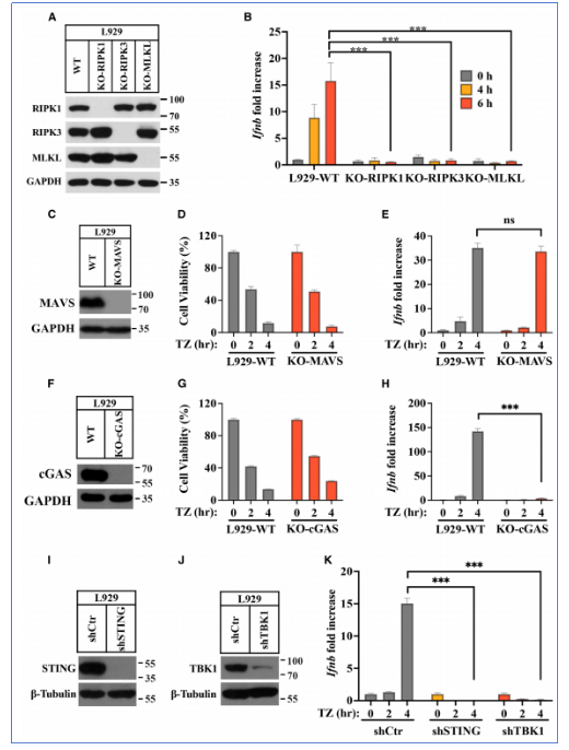 研究发现,在L929细胞系中,诱导坏死性凋亡(如,使用TNF-α+Z-VAD-FMK)可显著上调IFN-β(干扰素β)及其刺激基因(ISGs)的表达。该表达依赖于RIPK1、RIPK3和MLKL的完整性,且可被cGAS、STING或TBK1的敲除或抑制所阻断,表明坏死性凋亡通过cGAS-STING通路诱导I型干扰素表达。