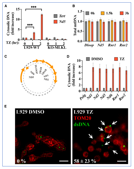 研究发现坏死性凋亡诱导后,mtDNA显著富集于胞质中,而核DNA无明显变化。该现象在多种细胞系中均可观察到,且依赖于MLKL的存在。mtDNA释放不伴随其总量增加,提示其来源于线粒体的泄漏而非复制增强。