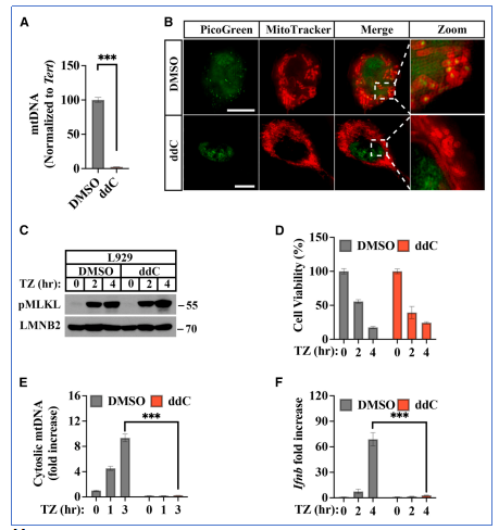通过使用mtDNA复制抑制剂(如ddC)构建mtDNA缺失细胞,研究发现即使细胞仍能发生坏死性凋亡,IFN-β的表达几乎被抑制。这证实mtDNA是激活cGAS-STING通路、诱导干扰素表达的关键胞质DNA来源。
