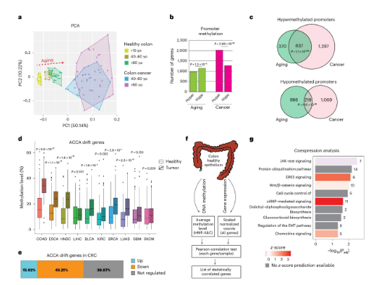 1. 人类队列分析: 利用TCGA数据库的健康与结肠癌样本,进行全基因组甲基化(WGBS)和转录组(RNA-seq)数据分析,通过主成分分析、差异甲基化分析和基因富集分析,鉴定衰老与癌症共有的ACCA甲基化漂变特征。