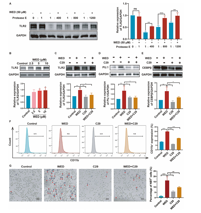 DARTS实验证实WED与TLR2直接结合;TLR2抑制剂C29显著抑制WED诱导的TLR2表达、PU.1/CEBPβ上调、CD11b表达及NBT阳性细胞比例;TLR2 siRNA敲低也抑制WED诱导的CD11b和Ly6G表达,表明TLR2是WED的关键作用靶点。