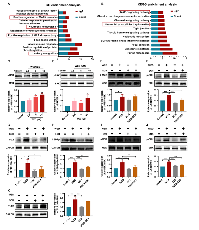 WED促进HL60细胞MEK和ERK磷酸化;ERK抑制剂SCH772984阻断WED诱导的ERK活化、PU.1/CEBPβ表达及中性粒细胞分化标志物上调;TLR2抑制剂C29抑制WED诱导的MEK/ERK磷酸化,而ERK抑制剂不影响TLR2表达,证实WED通过TLR2→MEK/ERK→PU.1/CEBPβ通路促进分化。