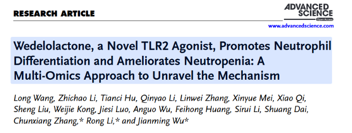 各位读者好,今天为大家带来一篇使用综合运用网络药理学结合分子对接、DARTS等前沿研究手段来研究天然香豆su化合物韦得内酯(WED)在中性粒细胞减少症中的治疗作用、潜在靶点和机制的高分文章,是由西南医科大学团队2025年12月在Advanced Science发表的,题为“Wedelolactone, a Novel TLR2 Agonist, Promotes Neutrophil Differentiation and Ameliorates Neutropenia: A Multi-Omics Approach to Unravel the Mechanism"。深入探究了天然香豆su化合物韦得内酯(WED)通过靶向TLR2激活MEK/ERK通路,促进中性粒细胞分化并增强其杀菌功能,加速中性粒细胞水平恢复,为中性粒细胞减少症治疗提供新靶点与策略。