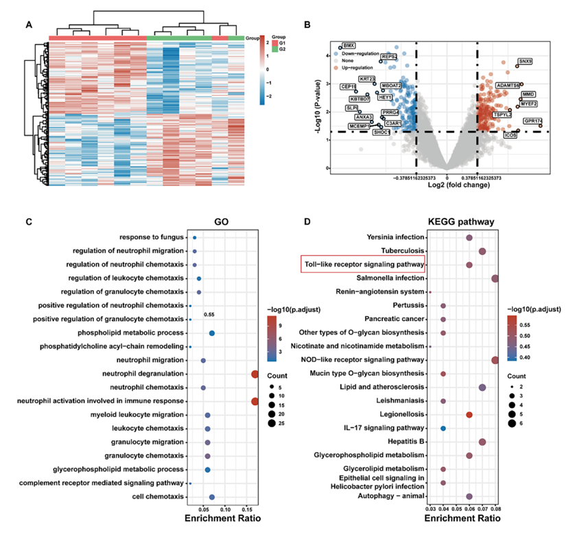 通过GEO数据库(GSE108894)分析中性粒细胞减少患者与健康人外周血粒细胞的差异表达基因(DEGs),GO富集显示DEGs主要参与中性粒细胞活化、脱颗粒等免疫过程,KEGG富集提示Toll样受体信号通路等可能为治疗靶点。